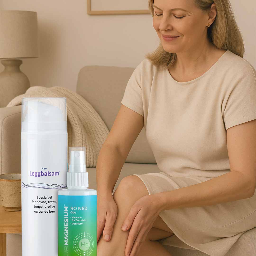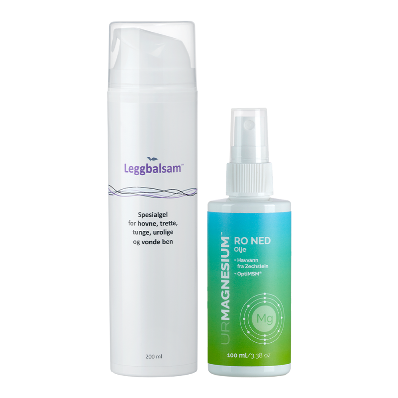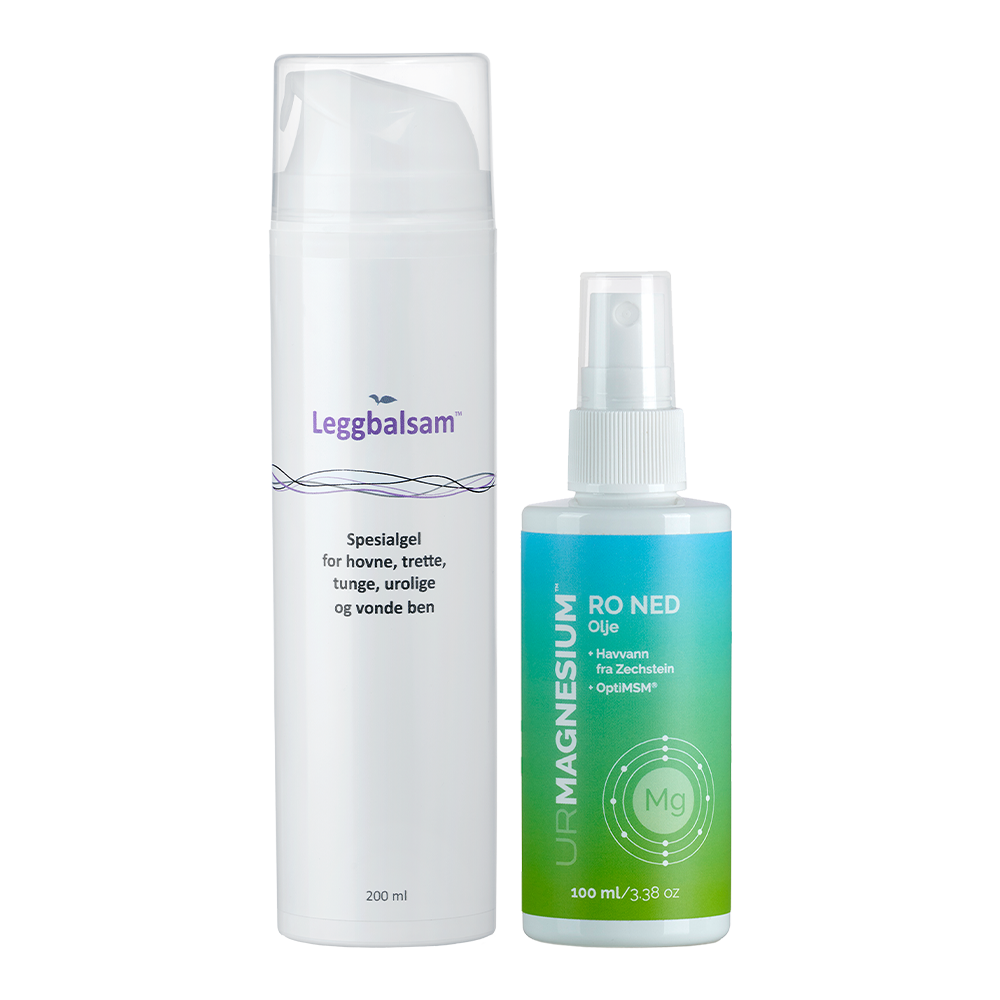 Hverdagsro-pakken kombinerer vår populære Leggbalsam og Ro Ned magnesium olje i praktiske pumpeflasker. Sammen gir de en naturlig og effektiv lindring for urolige ben – ved å tilføre magnesium gjennom huden, et alternativ som for mange kan være mer skånsomt enn tradisjonelle tabletter. Perfekt for deg som ønsker ro og velvære gjennom hele dagen, og spesielt når kvelden nærmer seg.