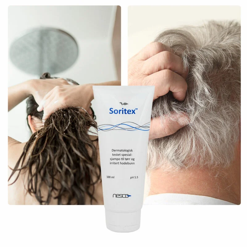 Soritex sjampo er svært drøy i bruk og løser effektivt opp overflødig fett og smuss. Gir fukt og forhindrer uttørking av hodebunnen. PH-verdi er 5,5 slik som normal frisk hud.