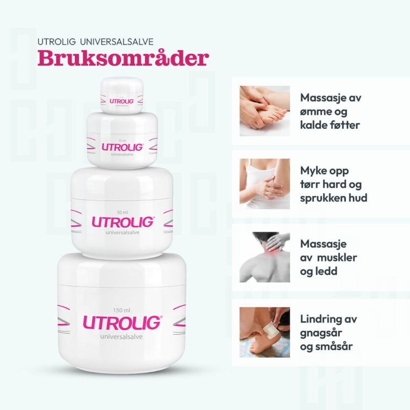 Utrolig Universalsalve ble opprinnelig utviklet i 1985 for å lindre ubehag ved bruk av tannproteser. Siden da har våre kunder opplevd at salven også kan virke lindrende på et bredt spekter av hudtilstander samt på ømme muskler.